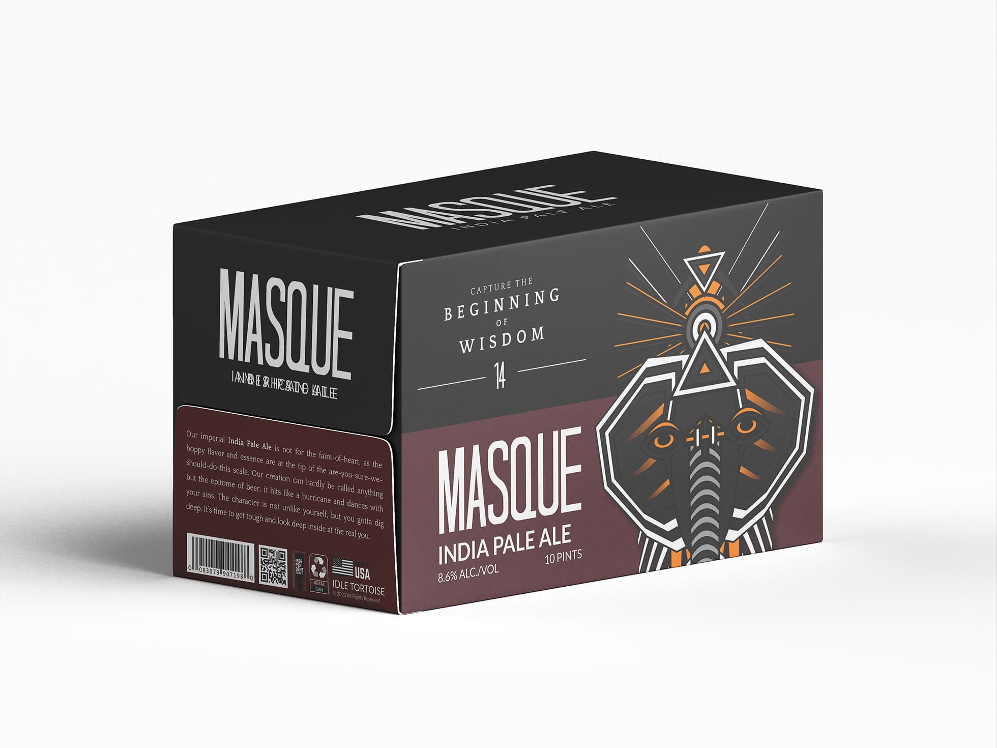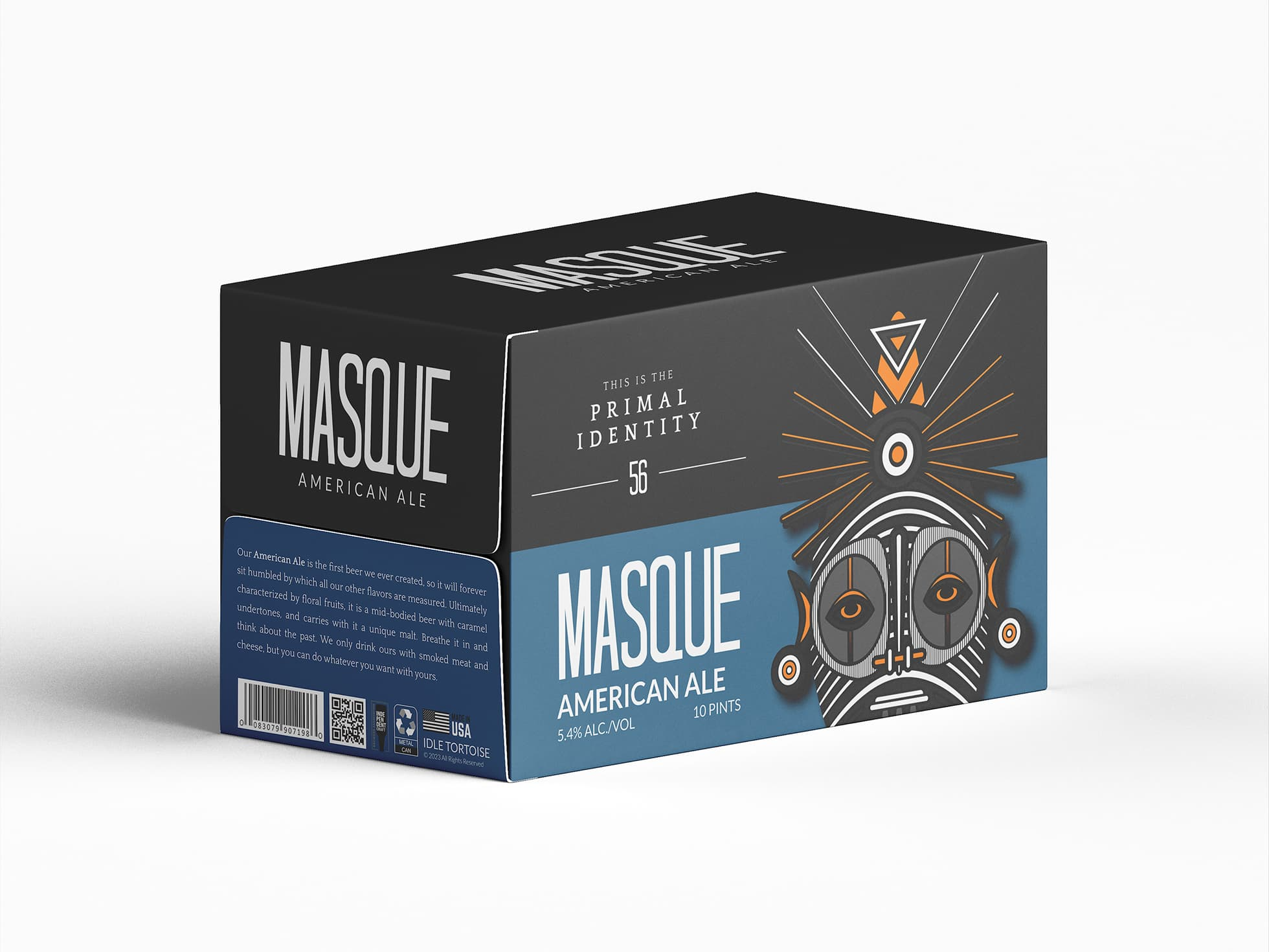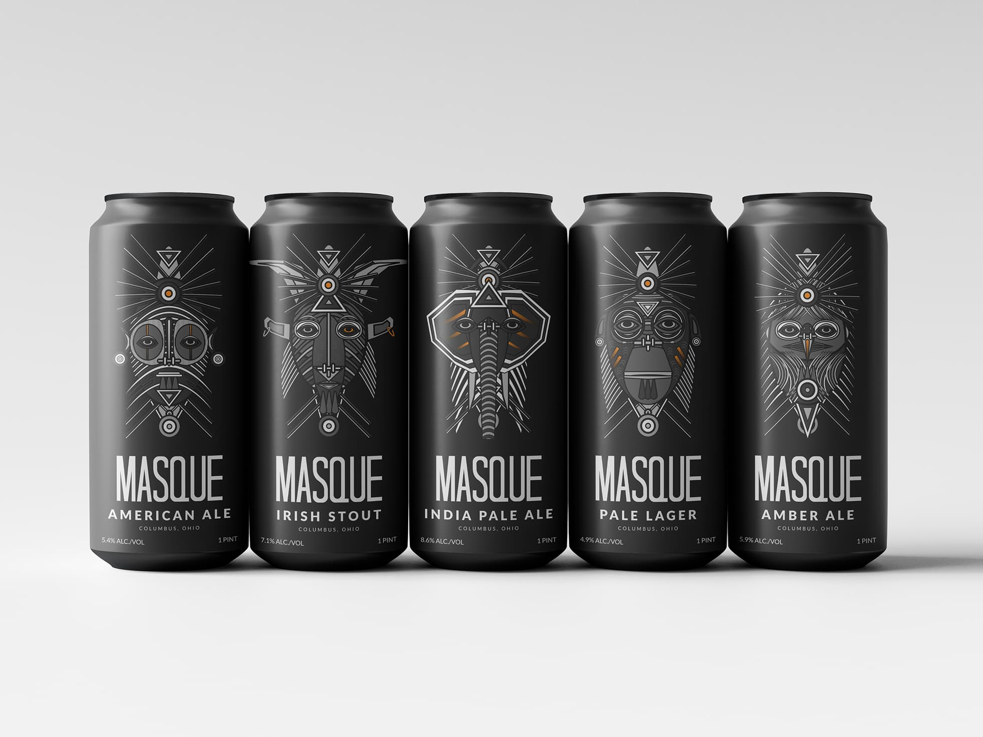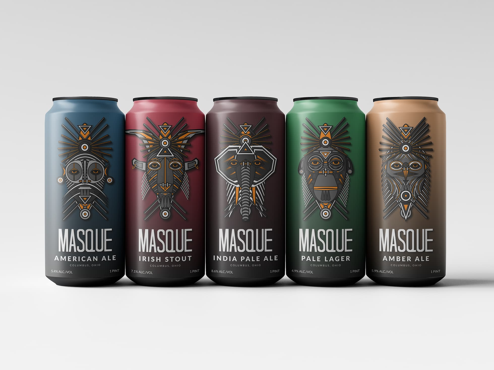 Masque is a private-label beer brand built around a totemic illustration system, with each variant carrying its own mask character, color identity, and narrative. Developed across can packaging, box design, and supporting brand assets.